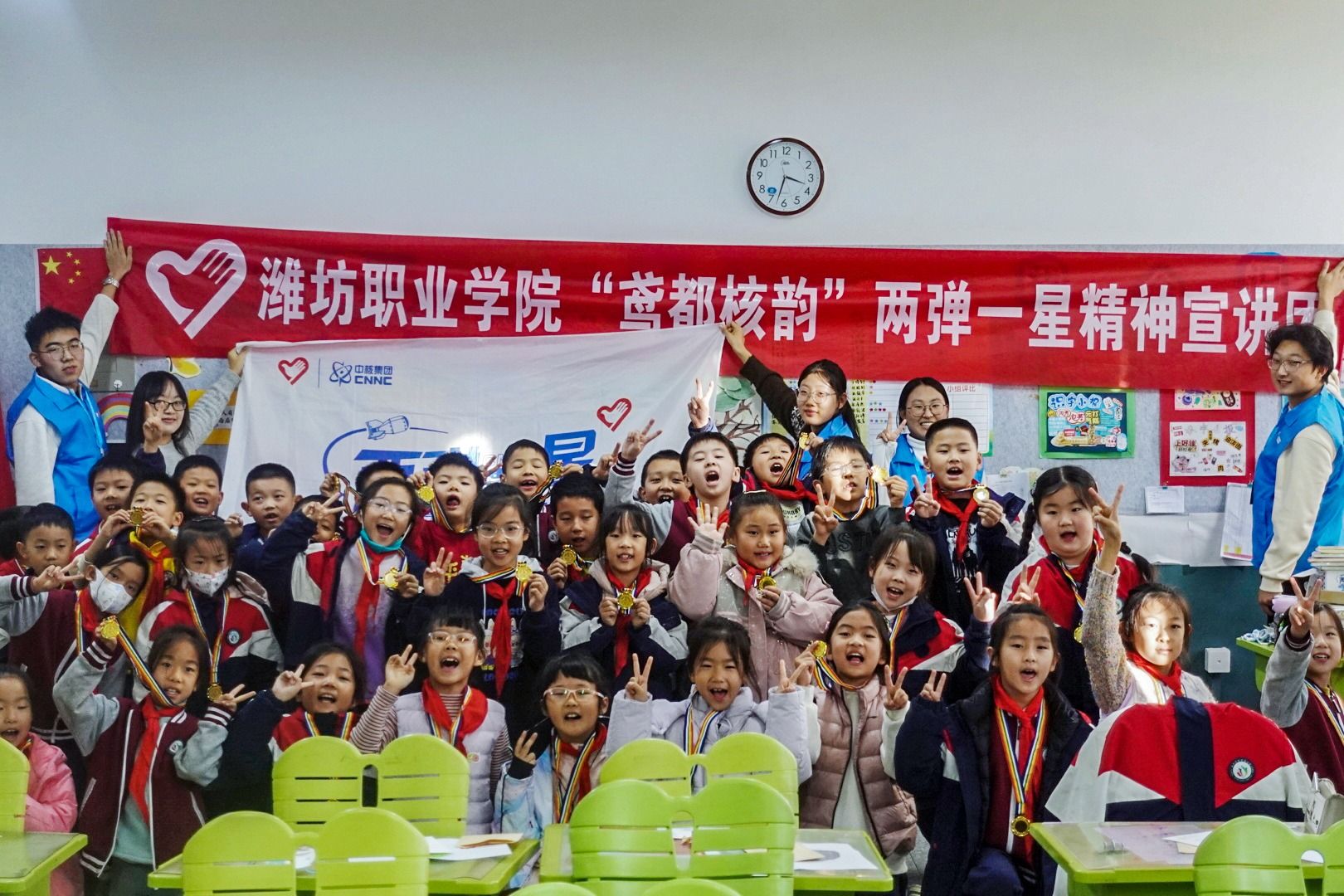 为深入学习贯彻习近平总书记关于传承和弘扬“两弹一星”精神的重要论述,推动红色基因在青少年心中落地生根,引导低年级学生感悟科研前辈奋斗初心、播撒科学报国种子,11月27日,beat365英国官方网站“鸢都核韵”“两弹一星”精神志愿宣讲团走进潍坊高新金马公学,为二年级8班小朋友带来一场趣味盎然的主题宣讲,让伟大精神在欢乐氛围中浸润童心。“小朋友们,几十年前咱们国家还没有厉害的原子弹和人造卫星,外国朋友觉得我们做不到,但一群勇敢的科学家爷爷奶奶,...更多 -