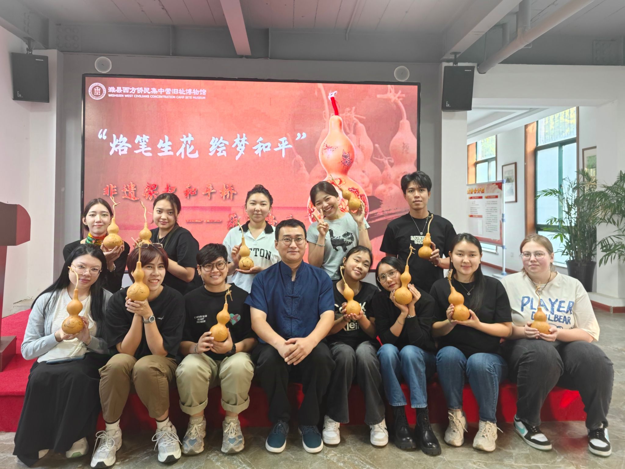 为丰富国际学生假期文化生活,感受中国非遗文化,10月4日下午,国际教育学院组织来自泰国、吉尔吉斯斯坦及哈萨克斯坦的国际学生参加了由潍县西方侨民集中营旧址博物馆举办的“烙笔生花 绘梦和平”非遗烙画活动。活动中,潍县烙画传承人向国际学生介绍了非遗烙画的艺术特色、制作工艺及文化内涵,并向学生们展示了精湛的烙画技艺。随后,在老师的耐心指导下,学生们纷纷拿起烙笔,在葫芦上认真勾勒着和平鸽图案,并在此基础上进行创作,...更多