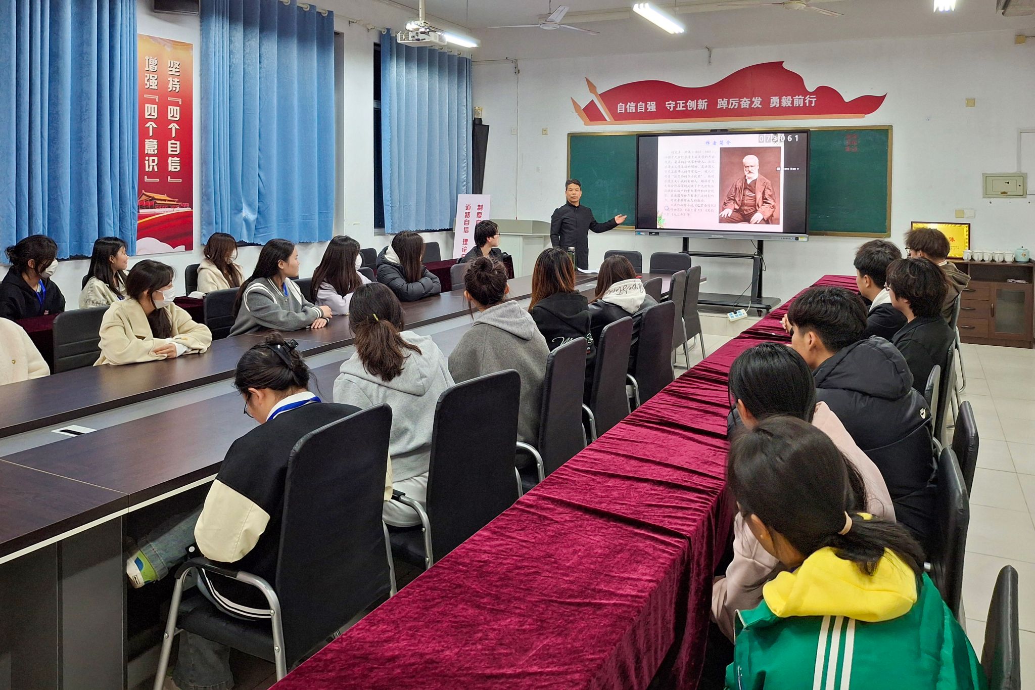 为营造和谐文明的校园文化氛围,丰富学生课余生活,增进学生对文学艺术的了解与热爱,提升其艺术素养,3月21日,通识教育中心导师卢京欣走进绿竹社区,开展了一场别开生面的“小说”大课堂进社区活动。活动中,卢老师凭借深厚的文学功底与生动的讲解风格,为同学们呈现了一场小说作品的艺术盛宴。他从法国文豪雨果的生平经历切入,深入剖析其文学成就对世界文学史的深远影响。在解读经典小说《巴黎圣母院》时,卢老师不仅声情并茂地梳理了故事主线,...更多 -