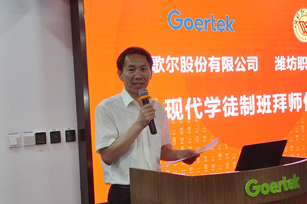 李菁华致辞。她代表企业对加入现代学徒制班级的同学表示热烈欢迎,希望同学们在歌尔公司发挥自己特长,将课堂学习的知识技能应用于实践,在学习本领、提高技能的同时为公司发展贡献力量,与企业共同成长。