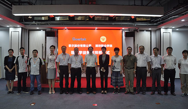 机电工程学院、歌尔PMF事业群人力资源部负责人为9名师傅颁发了聘书。43名学徒向师傅们行拜师礼并签订师徒协议。师傅和学徒代表作了发言。