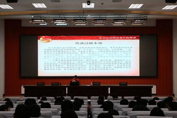 尹老师首先向同学们传达了团中央“一学一做”的主要内容,告诉同学们要坚定理想信念、练就过硬本领、勇于创新创造、矢志艰苦奋斗、锻炼高尚品格。其次,尹老师向同学们详细透彻地讲解了从严治团的要求,结合相关案例勉励同学们刻苦学习,苦练技能,争做有理想、有追求、有担当、有作为、有品质、有修养的“六有”大学生。最后,尹老师热情给予同学们“珍惜大好年华,牢记党和人民厚望,矢志奋斗,不懈进取,在建设中国特色社会主义事业的伟大征程中谱写出更加壮美的青春之歌”的青春寄语。