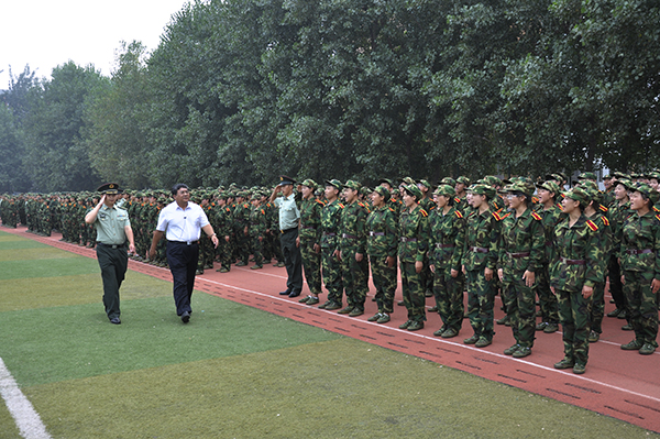 王家爱在军训指挥员的陪同下检阅各方队。