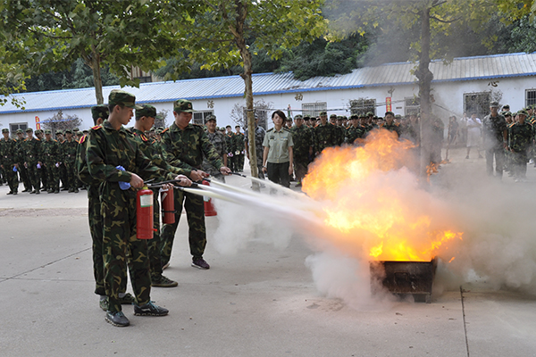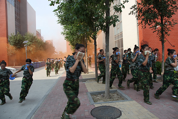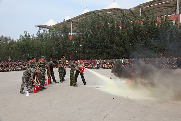 14点30分,随着演习总指挥一声令下,演习正式开始。模拟火险现场,工作人员拉开发烟罐,警报器随之响起,同学们在辅导员、班主任及宿舍管理人员的引导下,做着规避动作,向安全地带迅速撤离,到达集结场地清点人数并向演习总指挥报告。整个疏散演习过程时间短、速度快,井然有序,达到预期效果。随后进行消防灭火演练,消防大队教官向新生们讲解了消防知识并对灭火器使用方法进行了演示,部分学生在消防人员的指导下体验使用了灭火器。