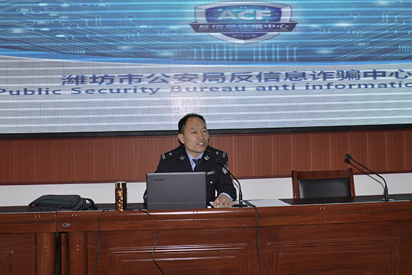 4月14日下午,潍坊市公安局反信息诈骗中心闫萍萍处长及丁洪武、周鹏警官等一行7人,在滨海校区清泽楼报告厅作预防网络电信诈骗知识讲座。安全保卫处、团委学生处相关人员及学生干部代表等参加。