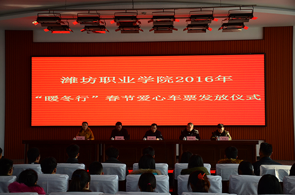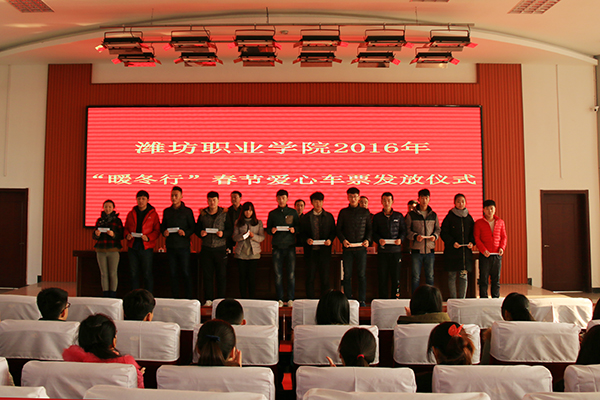 1月14日上午,学院2016年“暖冬行”春节爱心车票发放仪式在清泽楼报告厅举行。学院团委学生工作处、潍坊公路客运总站和滨海交通局负责同志出席仪式,接受捐赠车票的30名同学和潍坊日报社等相关新闻媒体参加活动。