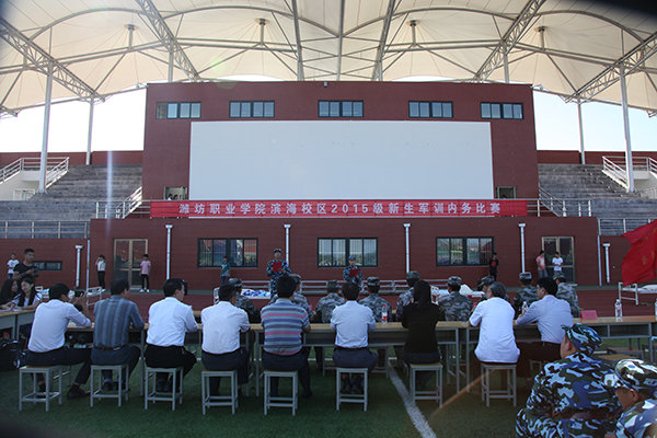 9月15日下午,学院滨海校区2015级新生军训内务比赛在体育场举行。团委学生工作处负责同志,各二级学院党支部书记、分管学生负责人、新生辅导员(班主任)以及滨海校区2015级全体新生观看了比赛。军训团领导担任比赛评委。