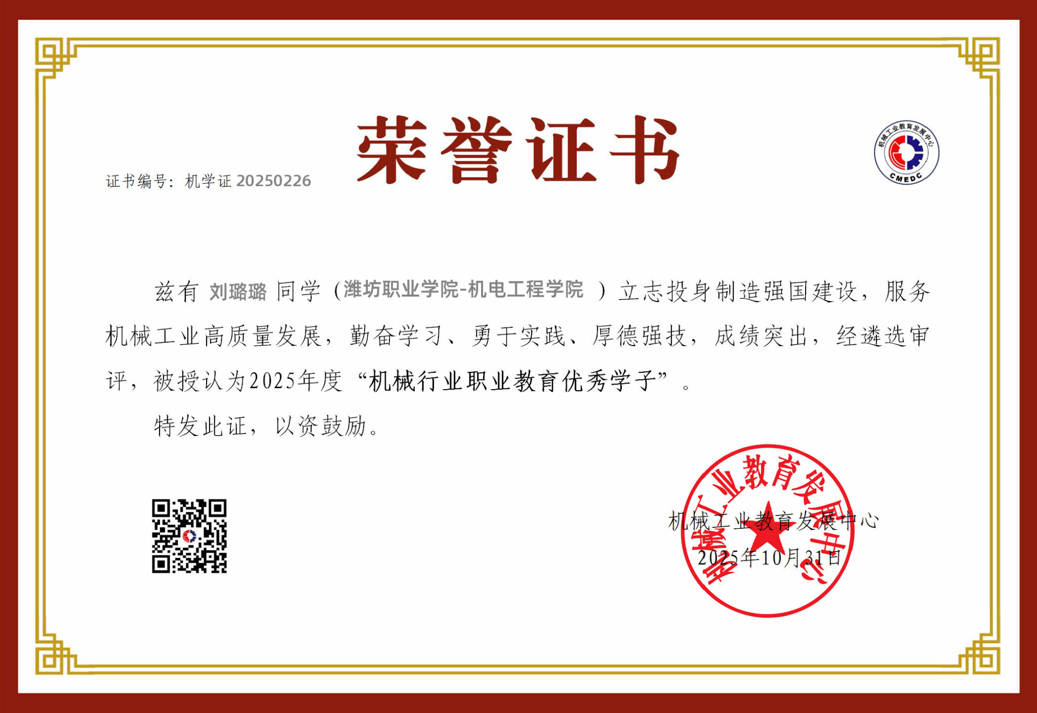 近日,首届“机械行业职业院校优秀学子”遴选认定工作结果正式揭晓。经院校推荐、专家评审及公示程序,全国共496名2025届毕业生获此殊荣。beat365机电工程学院刘璐璐、崔晓阳,汽车工程学院高峰、潘洪俊四位同学凭借优异的综合素质和突出的专业技能成功入选。