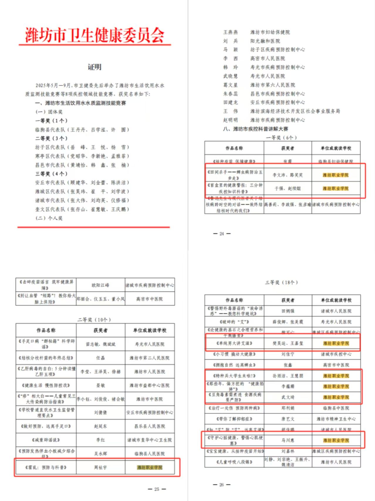 近日,由潍坊市卫生健康委员会主办的潍坊市疾控科普讲解大赛公布获奖结果,学院推荐作品荣获一等奖2项、二等奖1项、三等奖5项。