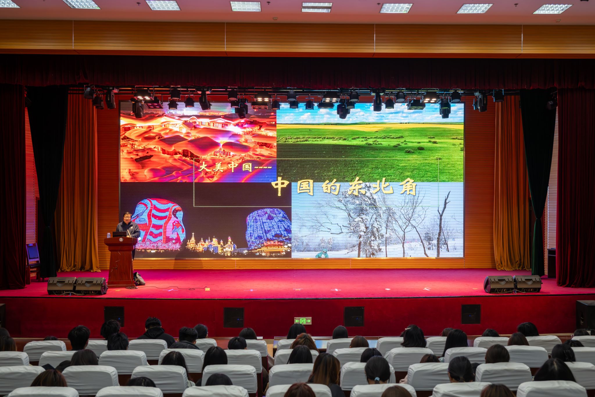 11月6日下午,学院第128场人文与思政讲座在图书馆报告厅举行。校园文化专员王移山教授作题为“大美中国——中国的东北角”的讲座,2025级200余名学生参加讲座。