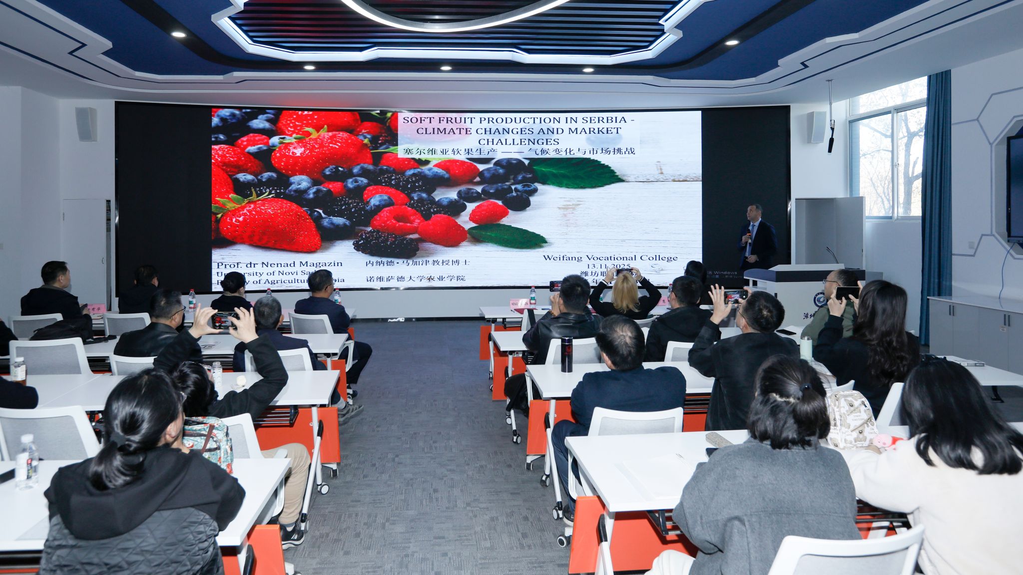 在座谈环节,双方就师生互访、学术交流及科研合作等内容进行了深入交流,并初步达成合作共识。当日下午,内纳德·马加津教授为农林科技学院师生作了题为《塞尔维亚软果生产——气候变化与市场挑战》的专题讲座,现场互动热烈。随后,学院为其举行了客座教授授牌仪式。