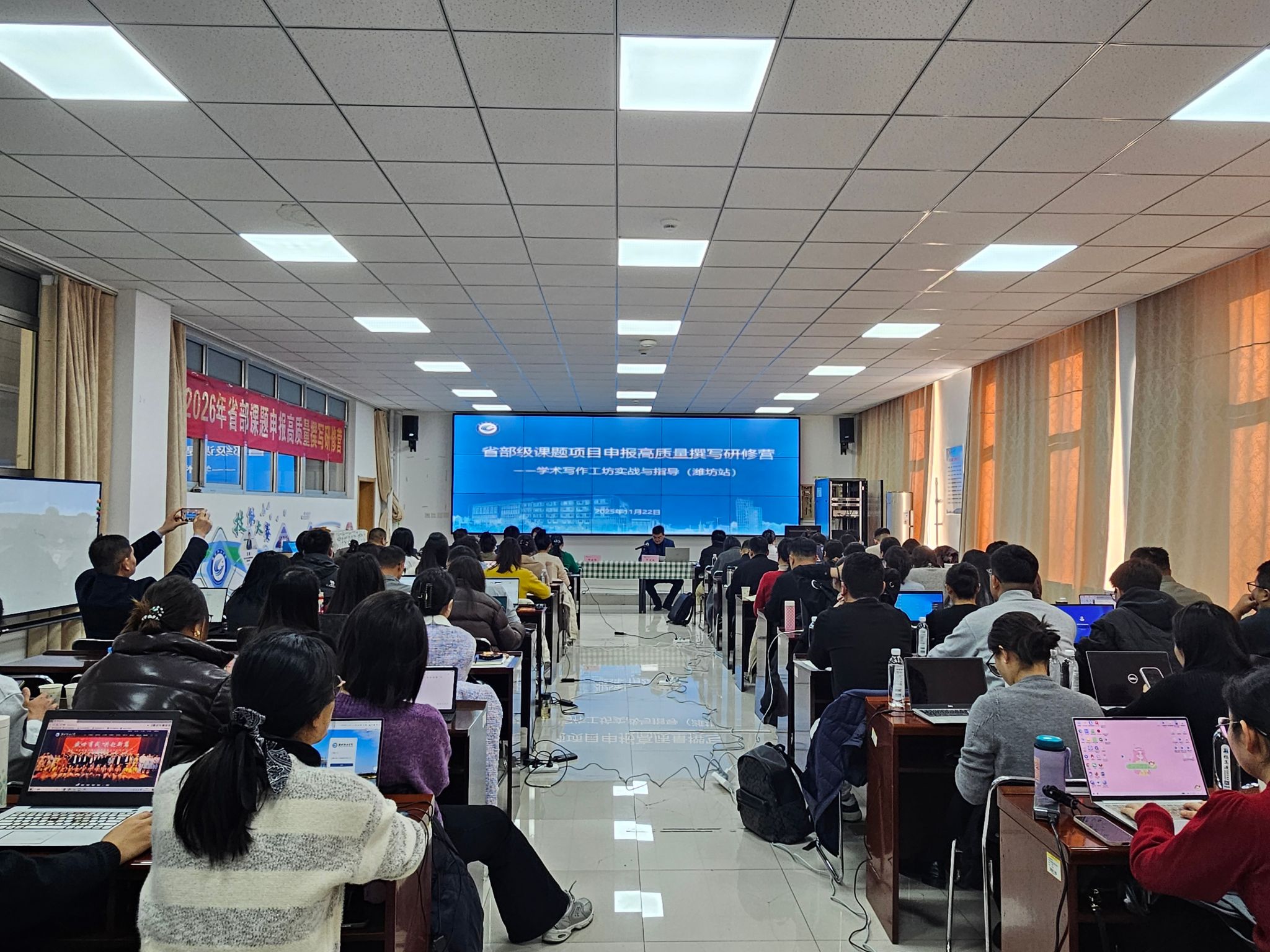 11月22日至23日,由教育部思想政治工作队伍研修中心主办、学院承办的“辅导员省部级课题申报高质量撰写研修营”在学院奎文校区顺利举行。本次研修营聚焦专职辅导员科研能力发展,旨在通过系统化、实战化培训,推动辅导员队伍将丰富的学生工作经验转化为高质量的科研成果,进一步提升辅导员相关科研项目申报水平。来自省内外22所高校的71名专职辅导员代表参加了本次研修。