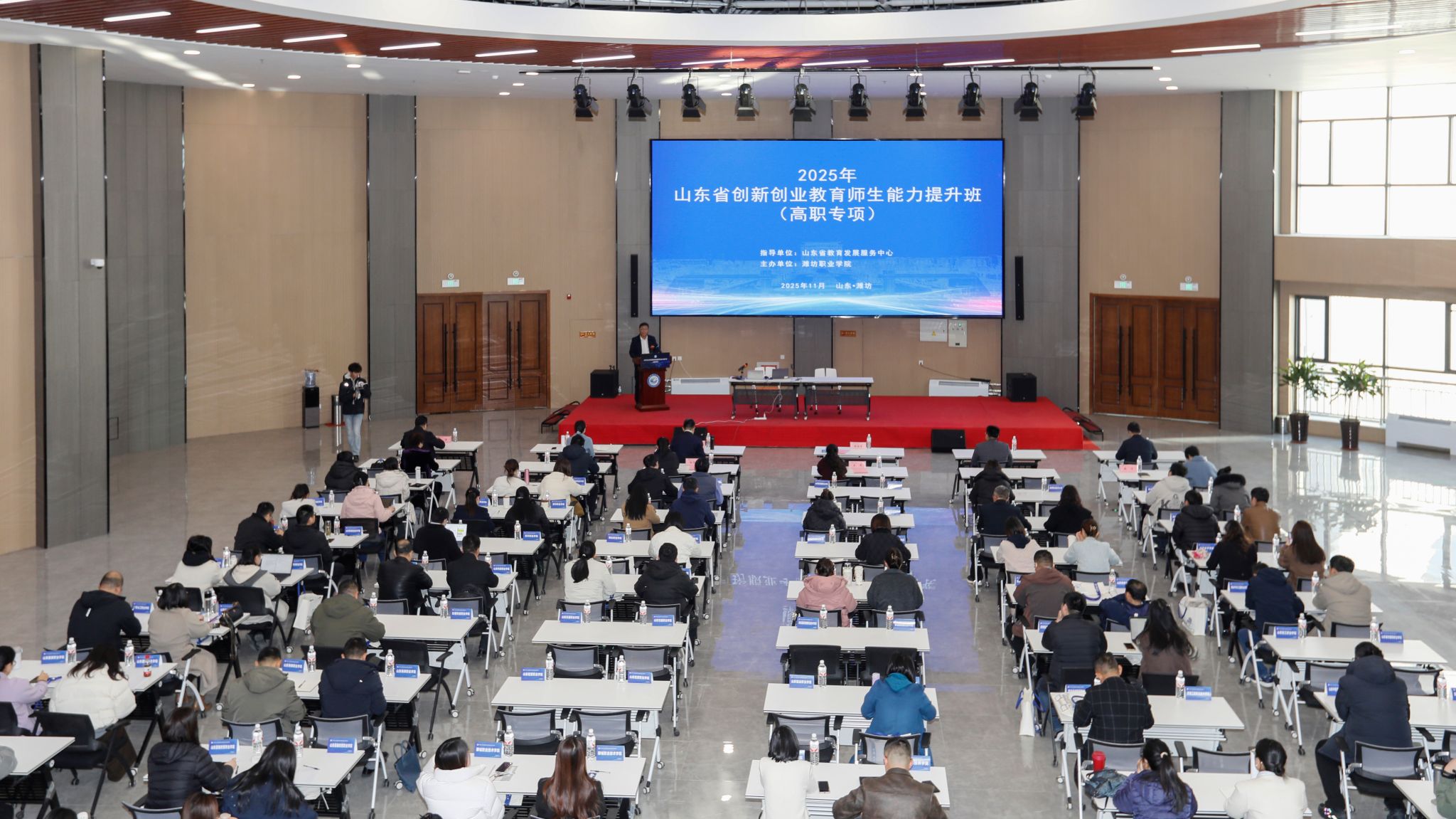 11月26日至29日,2025年山东省创新创业教育师生能力提升培训班在beat365举办。山东省教育发展服务中心党委书记、主任魏光祥,山东省教育厅职业教育处副处长钟京志,山东省教育发展服务中心党委委员、副主任孙培东以及就创工作部全体同志到校指导,学院院长韩瑞东,副院长陈美霞出席。培训班开班仪式由魏光祥主持,韩瑞东、钟京志分别致辞,来自省内47所职业院校的120余名学员参加培训。
