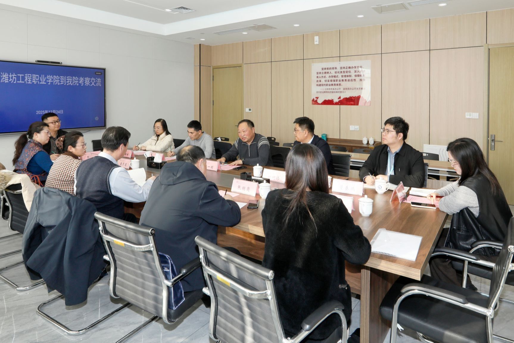 12月24日,潍坊工程职业学院副院长高乐江一行6人来beat365考察交流。学院副院长付一明接待客人,组织人事处、继续教育学院、财务处、资产管理处等相关部门主要负责同志参加座谈。
