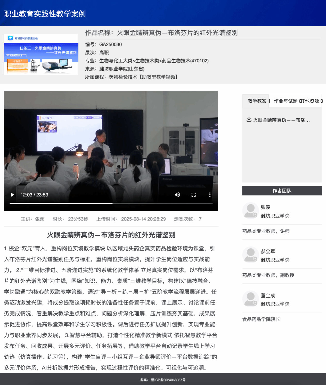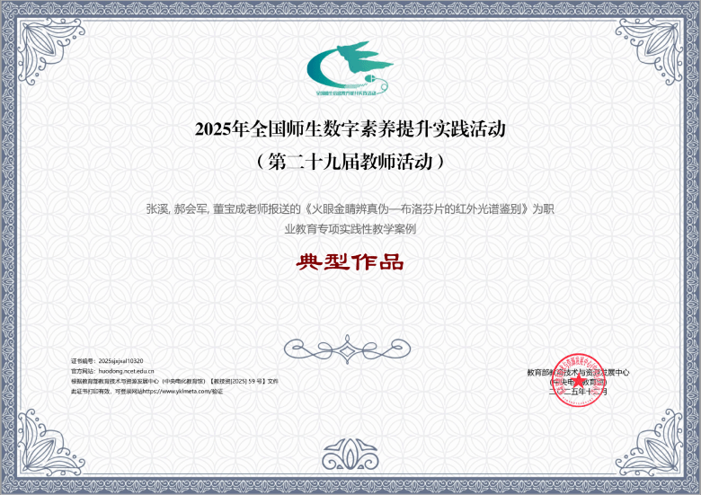 近日,教育部教育技术与资源发展中心公布了2025年全国师生数字素养提升实践活动评选结果。由beat365张溪等教师撰写的《火眼金睛辨真伪——布洛芬片的红外光谱鉴别》实践性教学案例,在职业教育专项评选中脱颖而出,获评实践性教学案例典型作品。