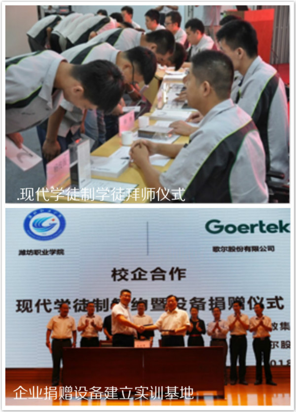 针对这些问题,2012年学院与歌尔探索德国双元学徒制人才培养,2014年与歌尔组建了数控技术专业现代学徒制班,探索现代学徒制高技能人才培养规律。与歌尔的人才培养,以准职业人的培养理念,创新实施招生即招工、入校即入厂、毕业即就业的“产教结合,学岗融通”现代学徒制人才培养模式,将生产劳动和社会实践融入到人才培养的各个环节。融通教学内容与职业岗位需求,构建职业素质教育体系和实践教学体系。培养过程分为基本素质培养、核心技能训练、企业实践历练三个阶段,将职业素养、专业理论学习、综合能力培养有机结合,按照企业对员工的标准培养学生,使其具备“准职业人”的基本素质,为即将进入企业成为员工零距离对接,实现校企双主体育人。
