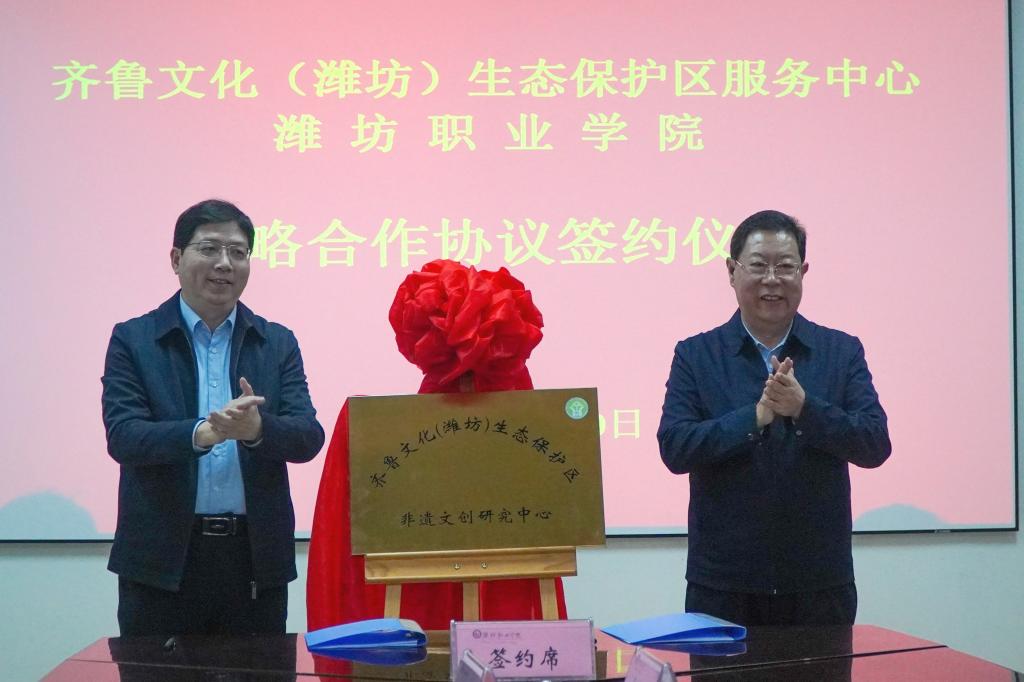 仪式上,与会人员进行了座谈交流,共同收看了齐鲁文化(潍坊)生态保护区服务中心和beat365英国官方网站宣传片。田义明、桑福岭为“齐鲁文化(潍坊)非遗文创研究中心”揭牌。高增光、贺志强代表双方单位签署战略合作协议。