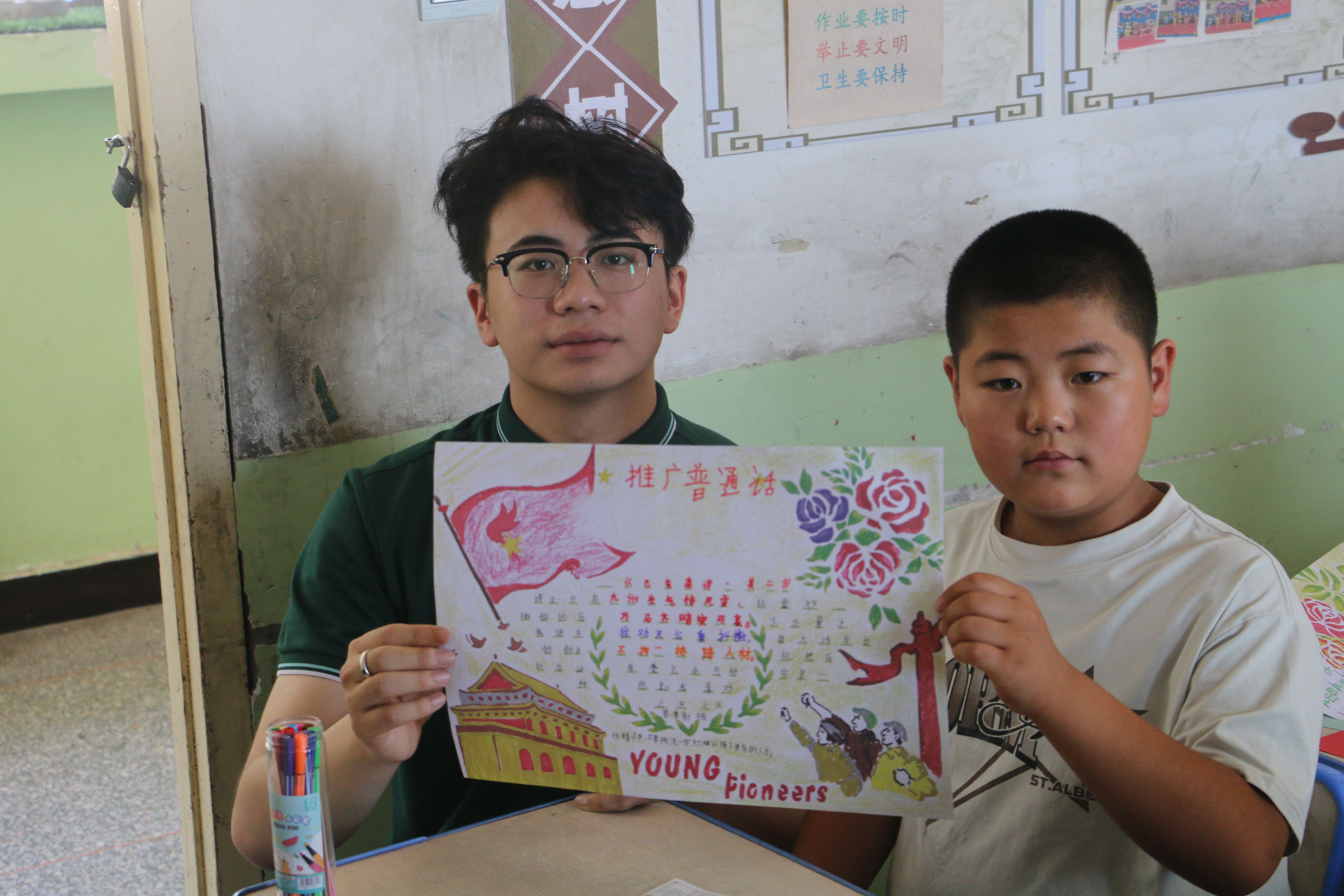 童“语”绘新篇,乡兴童心连。志愿服务团队前往甘肃省靖远县刘川镇雒庄小学,以支教的方式开展“推普助力乡村振兴”社会实践活动。在前期准备阶段,志愿服务团队结合当地特点和学生使用普通话情况,精心设计教学活动,确保以寓教于乐的形式开展普通话推广活动。推普课堂上,志愿者通过PPT向学生细致阐述普通话的重要性。组织学生用真挚的情感、极具感染力的声音,精彩演绎了《如果信仰有颜色》《歌唱祖国》。通过“我是小小推普员”绘画课堂、“讲好普通话,写好规范字”书法课堂、“诵读中华经典”课堂等,以寓教于乐的方式,让学生们在“诵、读、写”的过程中感悟中华优秀传统文化和优秀语言文化的魅力。最后,志愿者采用“推普技能+”的形式,围绕艺术美育,在制作潍坊风筝、传统剪纸等手工制作体验中,提升了学生的语言文化素养,有效促进了鲁甘文化的融合交流。