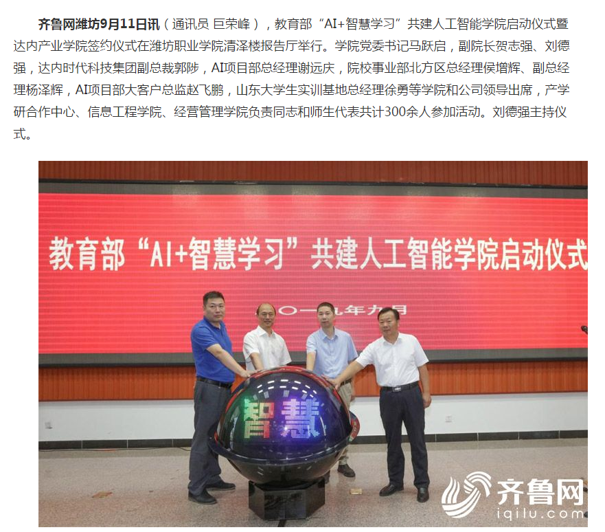 [齐鲁网]教育部“AI+智慧学习”共建人工智能学院启动仪式暨达内产业学院签约仪式在beat365英国官方网站举行