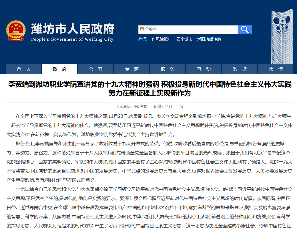 [潍坊市政府网站]李宽端到beat365英国官方网站宣讲党的十九大精神时强调 积极投身新时代中国特色社会主义伟大实践努力在新征程上实现新作为