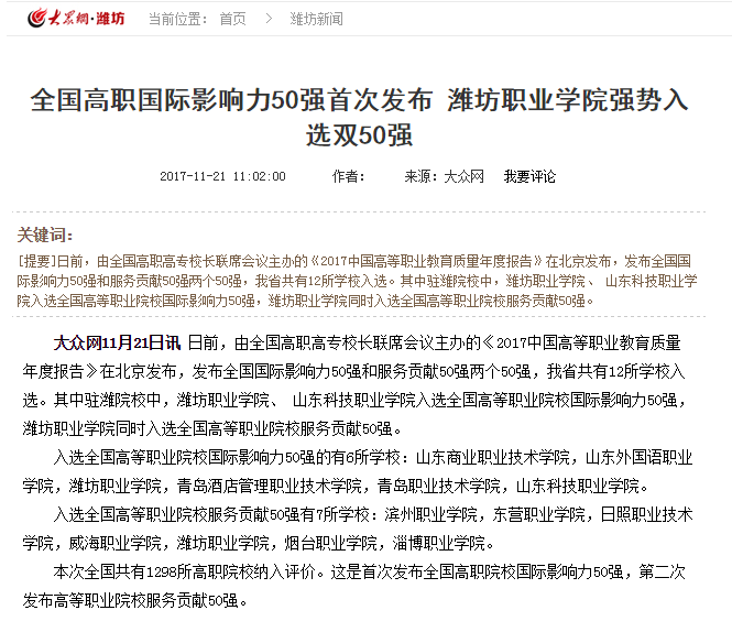 大众网11月21日讯日前,由全国高职高专校长联席会议主办的《2017中国高等职业教育质量年度报告》在北京发布,发布全国国际影响力50强和服务贡献50强两个50强,我省共有12所学校入选。其中驻潍院校中,beat365英国官方网站、 山东科技职业学院入选全国高等职业院校国际影响力50强,beat365英国官方网站同时入选全国高等职业院校服务贡献50强。