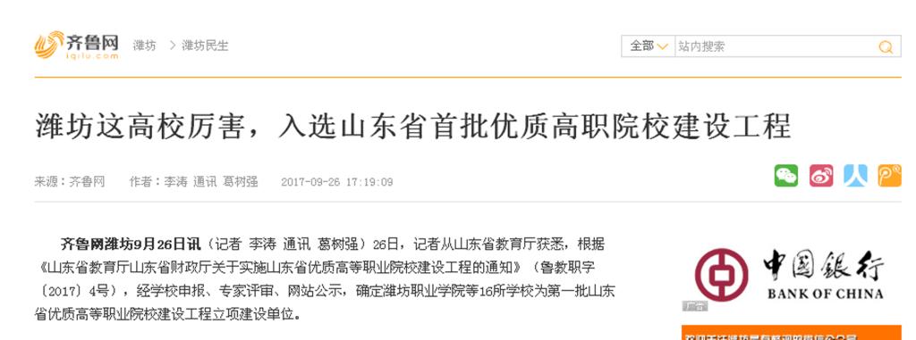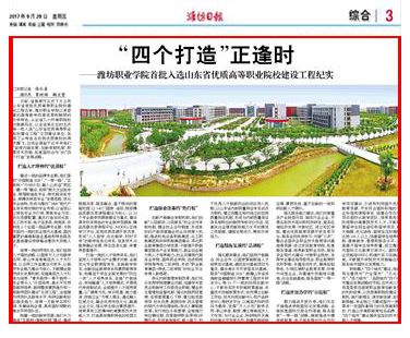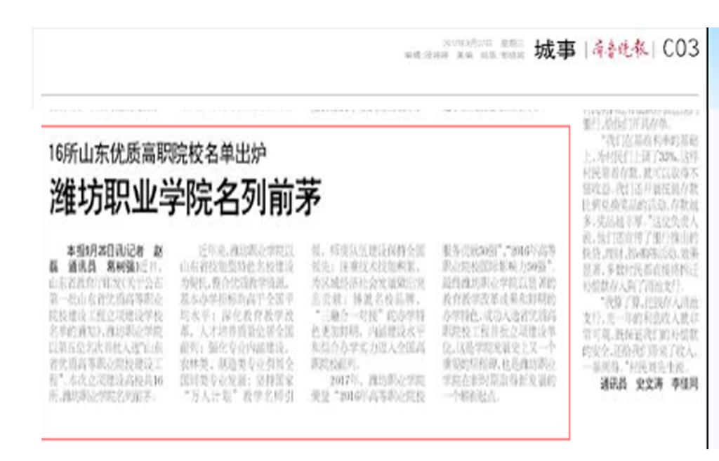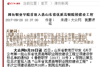 近日,山东省教育厅公布第一批山东省优质高等职业院校立项建设工程,beat365以第五位名次首批入选“山东省优质高等职业院校建设工程”,潍坊日报、潍坊电视台、齐鲁晚报、今日头条、齐鲁网、大众网、潍坊传媒网、潍坊新闻网、滨海日报等多家媒体作了多角度宣传报道,彰显了学院显著的教育教学改革成果和鲜明的办学特色,向全省全国展示了beat365职业教育发展新成就。