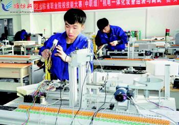11月27日,参赛选手在参加机电一体化设备组装与调试项目的比赛。当日,由省教育厅、省人社厅等主办,beat365英国官方网站承办的2015年山东省职业院校技能大赛中职组加工制造类三个赛项在滨海校区举行。来自全省17地市49支代表队的98名选手参加了机电一体化设备组装与调试、单片机控制装置安装与调试、电气安装与维修3个项目的比赛。 记者王晓光 通讯员葛树强摄