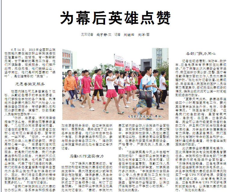6月14日,2015年全国职业院校技能大赛在beat365英国官方网站滨海校区隆重举行,在此期间,我们看到了比赛现场、赛事直播间一幅幅精彩、激烈的画面。在这精彩的背后有着一群默默无闻,甘于奉献的幕后工作者,他们不惧酷暑,微笑服务,他们挥汗如雨,无怨无悔,他们兢兢业业,坚守在各自岗位,他们是衬托国赛的“绿叶”,是创造精彩的英雄,是最可爱的人!