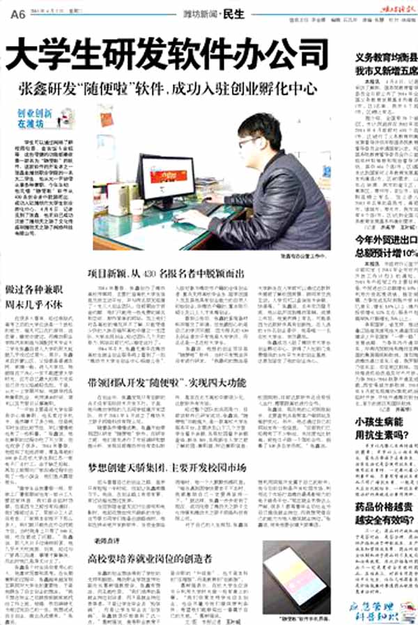 学生可以通过网络了解校园街景、查询饭卡余额等,这些便捷的功能都要依靠一款名为“随便啦”的软件。这款软件的开发者之一张鑫是beat365英国官方网站的一名大二学生,他从大一开始便从事各种兼职。今年年初,他凭借“随便啦”软件从430名创业者中脱颖而出,成功入驻潍坊市大学生创业孵化中心。4月6日,记者见到了张鑫,他目前已成功注册了潍坊天之骄子文化传媒和潍坊天之骄子网络科技有限公司。