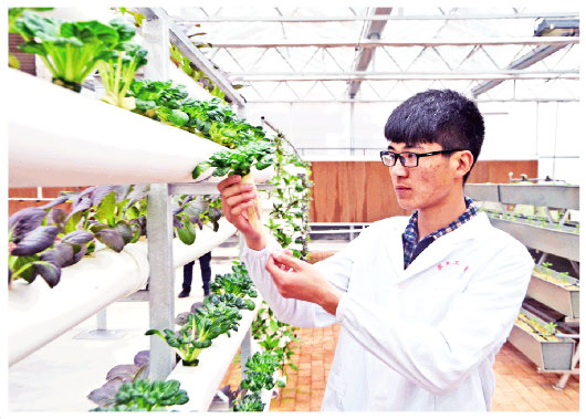 学生正在观测管道栽培作物的生长情况。