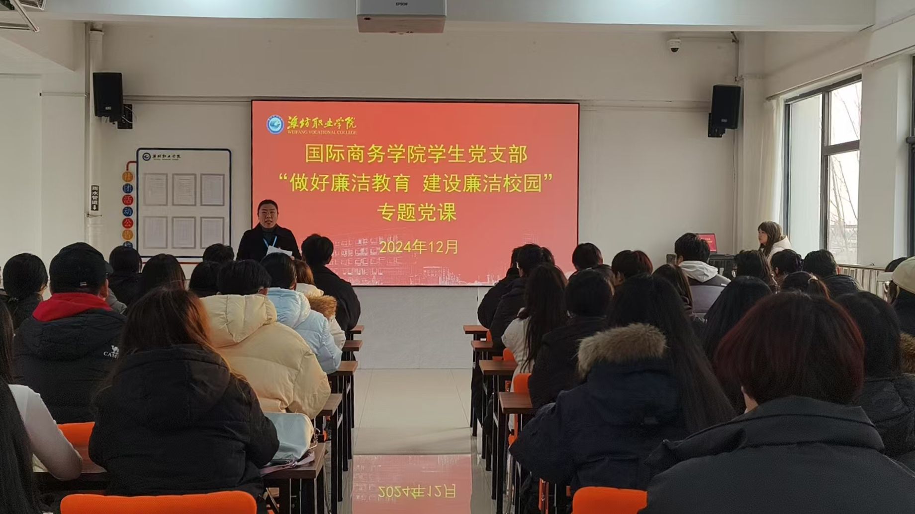 为发挥学院“一站式”学生社区功能型党支部育人功能,推动“清廉校园”建设,12月12日下午,蕙兰社区开展廉洁文化主题党课活动,国际商务学院学生党支部负责同志面向学生预备党员和入党积极分子代表授课。