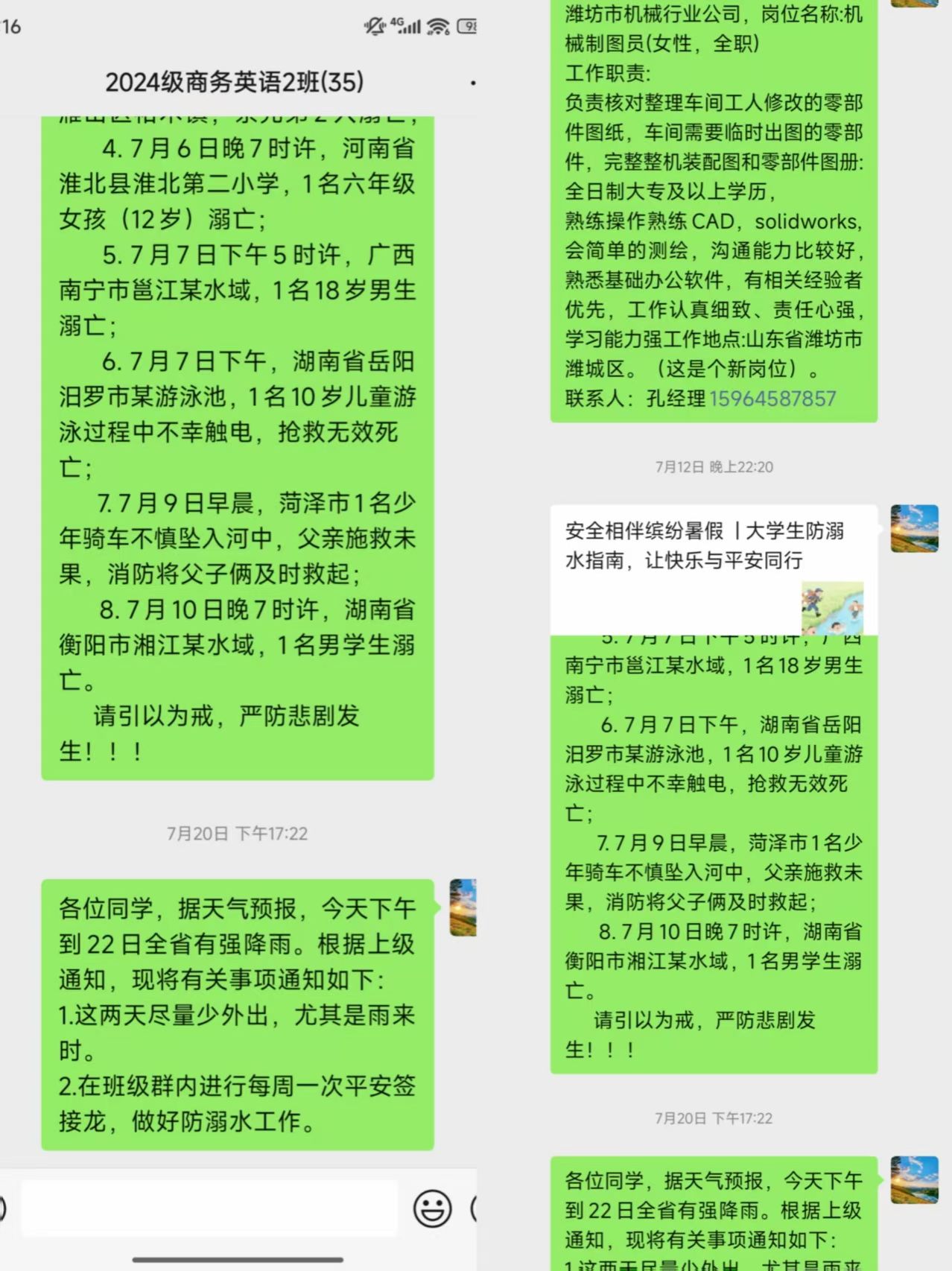针对学生地域分布广、暑期实习实践多的特点,beat365充分利用数字化手段,通过“每周安全播报”定点发送班级微信群等形式,实现安全教育的广覆盖和精准触达。通过假期“云家访”的方式,与学生及家长共同做好防溺水工作,重申“六不”准则和家长监护责任,并定期在家长群推送暑期防溺水安全指南。坚持做到严格执行值班制度,辅导员每周联系学生,动态跟踪“不掉线”,通过线上方式与学生保持联系,了解动态,传递关心。