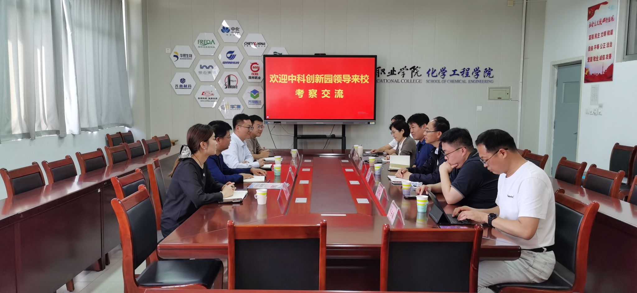 在随后的座谈交流中,化学工程学院对房金厚一行的到访表示热烈欢迎,并围绕化学工程学院办学特色、技术研发成果及技能培训体系等方面作了介绍,希望双方能够依托各自资源优势,在产教融合、技术攻关与成果转化等方面探索更多合作可能。房金厚介绍了潍坊生态环保材料与技术研究院的研究方向与技术服务体系等基本情况。陈广源分享了中科(潍坊)创新园在推动科技成果转移转化方面的实践经验,并就双方共建概念验证中心的可行性进行了探讨。