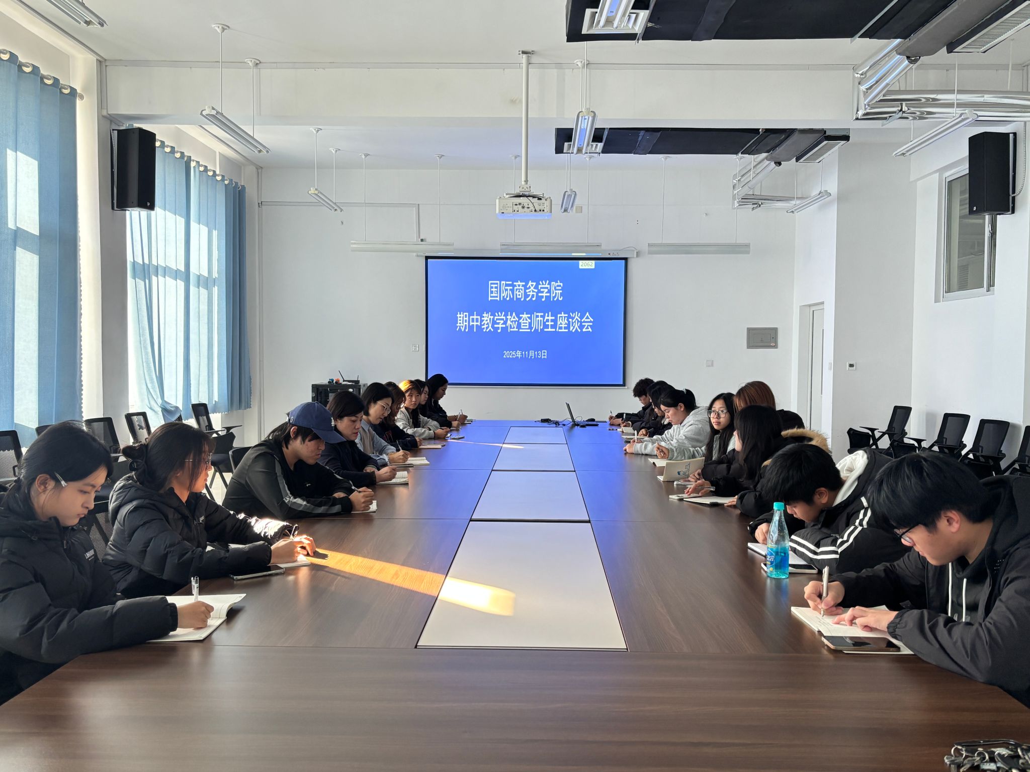 为了解教学运行和学生管理情况,畅通师生沟通渠道,及时解决管理过程中存在的问题,进一步提升育人实效,11月13日下午,国际商务学院举行期中教学检查师生座谈会。2025级各班学生代表、教学管理办公室负责人及辅导员办公室负责人参加会议。
