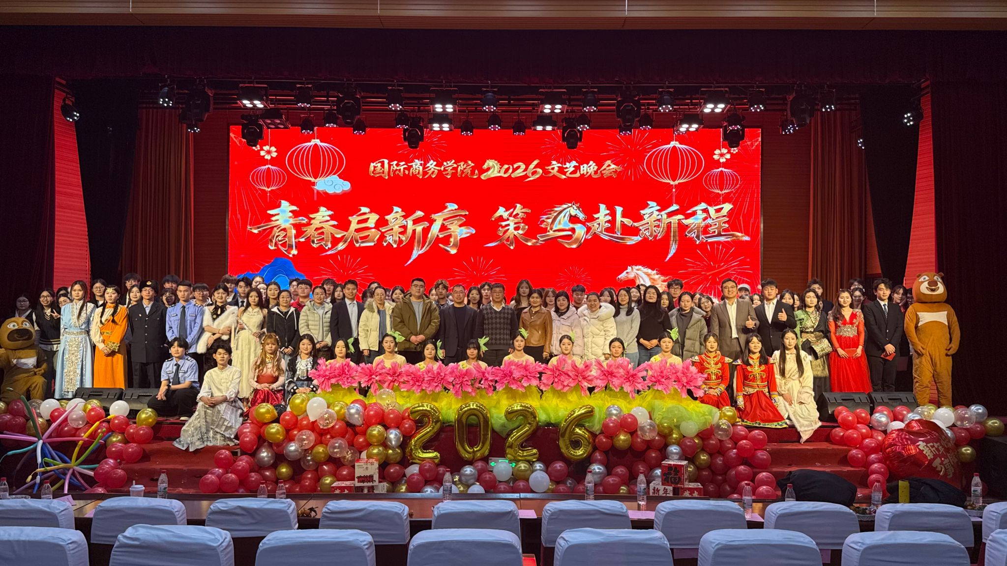 整场晚会节目形式多样、内容积极向上,充分彰显了国际商务学院学子多才多艺、全面发展的青春风貌,以及师生同心、共创未来的昂扬斗志。展望2026,国际商务学院全体师生必将以此为契机,继续高扬青春风帆,挥洒奋斗汗水,在学院“建高升本”的宏伟蓝图与新征程中,奋力谱写更加璀璨夺目的青春华章!(王静供稿)