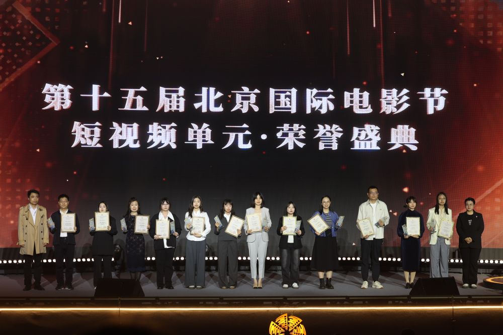 2025年4月25日,第十五届北京国际电影节短视频单元荣誉盛典在中国传媒大学举办。这是获奖选手上台领奖。新华社记者 卢烨 摄