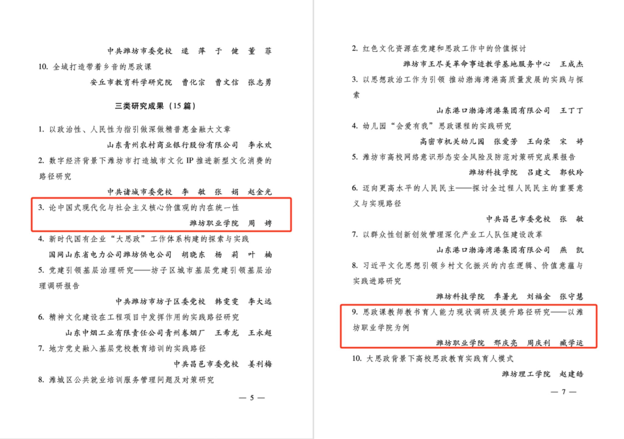 近日,潍坊市思想政治工作研究会公布了2024年度优秀研究成果评选结果,beat365马克思主义学院申报的2项成果获奖。