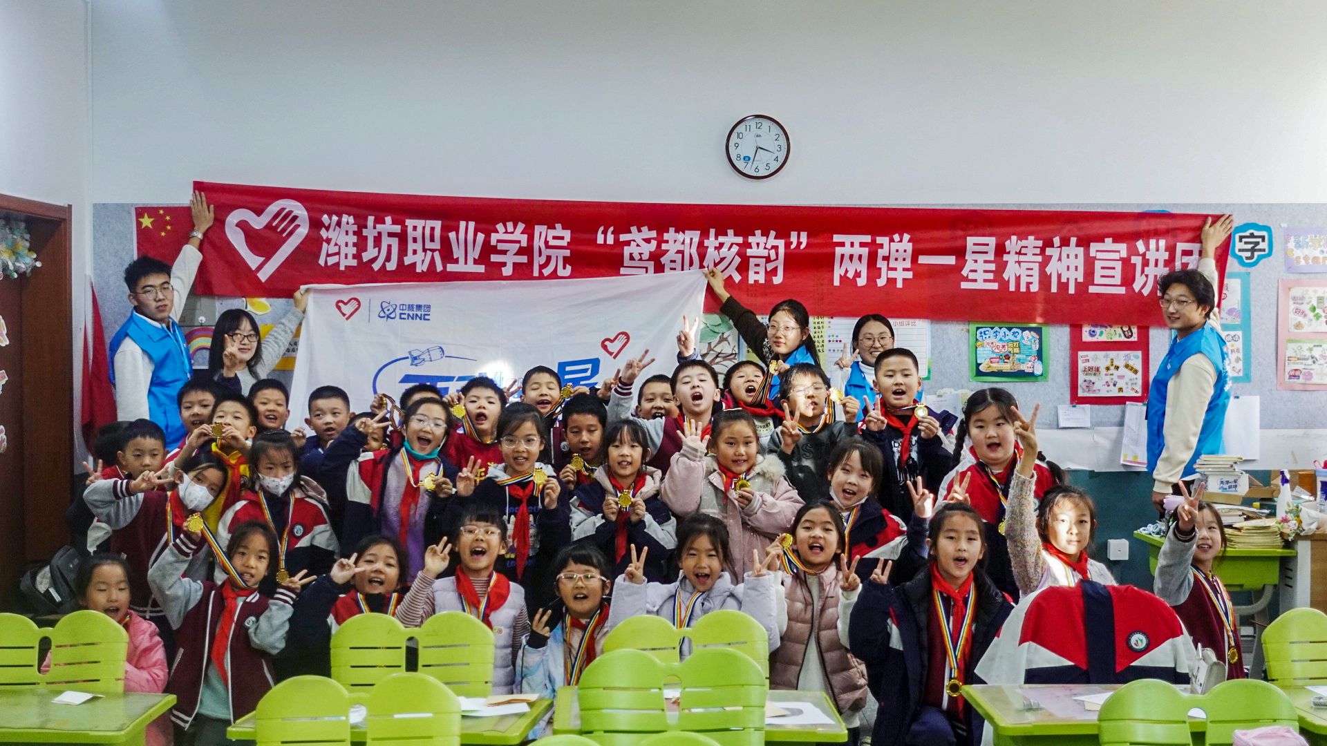 为深入学习贯彻习近平总书记关于传承和弘扬“两弹一星”精神的重要论述,推动红色基因在青少年心中落地生根,引导低年级学生感悟科研前辈奋斗初心、播撒科学报国种子,11月27日,beat365英国官方网站“鸢都核韵”“两弹一星”精神志愿宣讲团走进潍坊高新金马公学,为二年级8班小朋友带来一场趣味盎然的主题宣讲,让伟大精神在欢乐氛围中浸润童心。