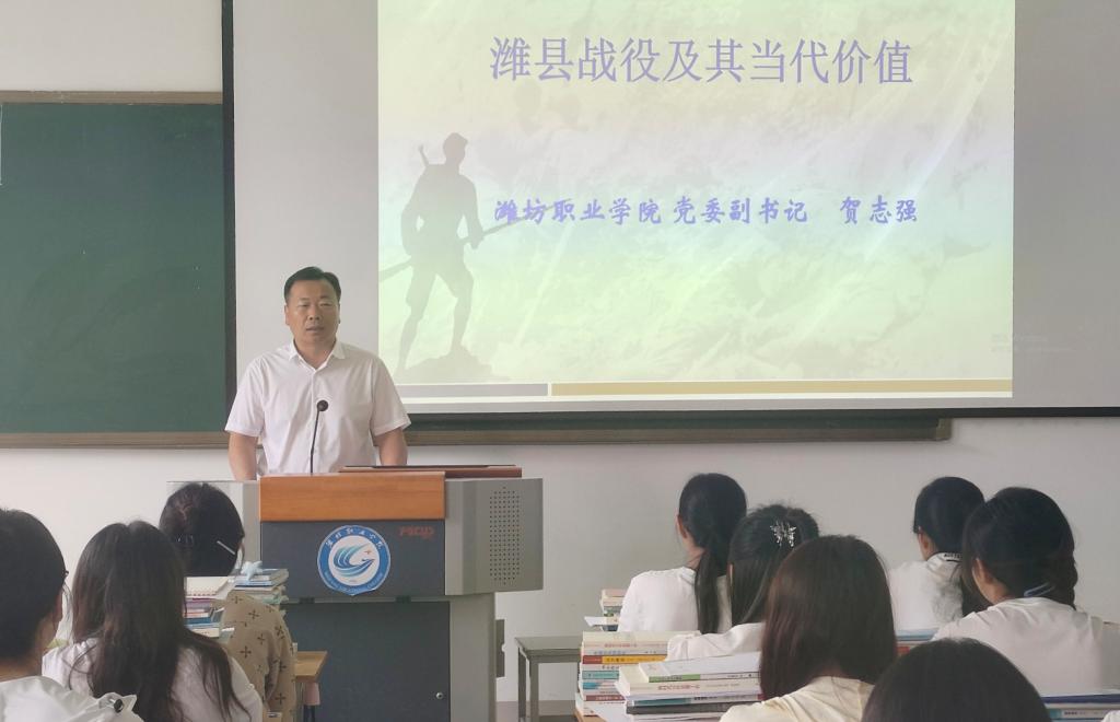 为庆祝新中国成立75周年,深入学习习近平总书记对学校思政课建设重要指示精神,积极推动大思政课建设,6月25日下午,学院党委副书记贺志强以“潍县战役及其当代价值”为题,为2022级党务工作班同学上了一堂生动而精彩的思政课。