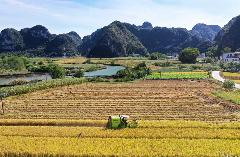 △2024年10月24日,在广西天等县都康乡,收割机在田间收获水稻。