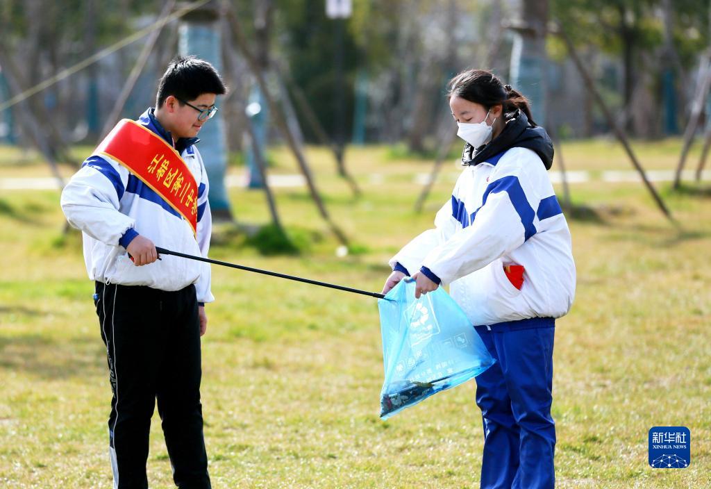 2022年3月5日,在江苏省扬州市江都区双拥公园,江都区第二中学学生在学雷锋主题活动中捡拾垃圾。
