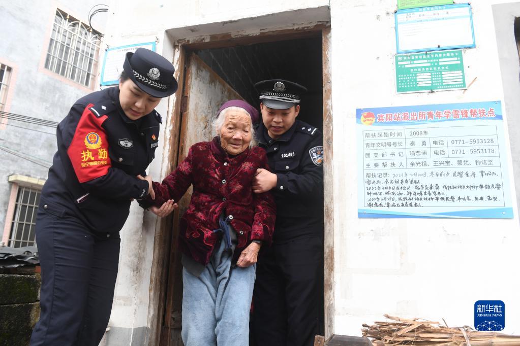 2023年2月5日,在广西宾阳县黎塘镇梁村,宾阳站派出所民警扶着黄爱明老人走出家门。92岁的黄爱明老人是当地一名五保户老人。十余年来,每逢周末和节假日,派出所青年民警志愿者会带着一些生活用品去看望老人,陪她聊天,帮她做家务等。
