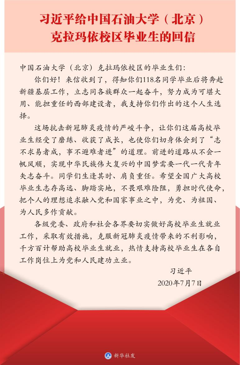 志不求易者成,事不避难者进。“得知你们118名同学毕业后将奔赴新疆基层工作,立志同各族群众一起奋斗,努力成为可堪大用、能担重任的西部建设者,我支持你们作出的这个人生选择。”2020年7月7日,总书记给中国石油大学(北京)克拉玛依校区毕业生回信,肯定他们到边疆基层工作的选择。